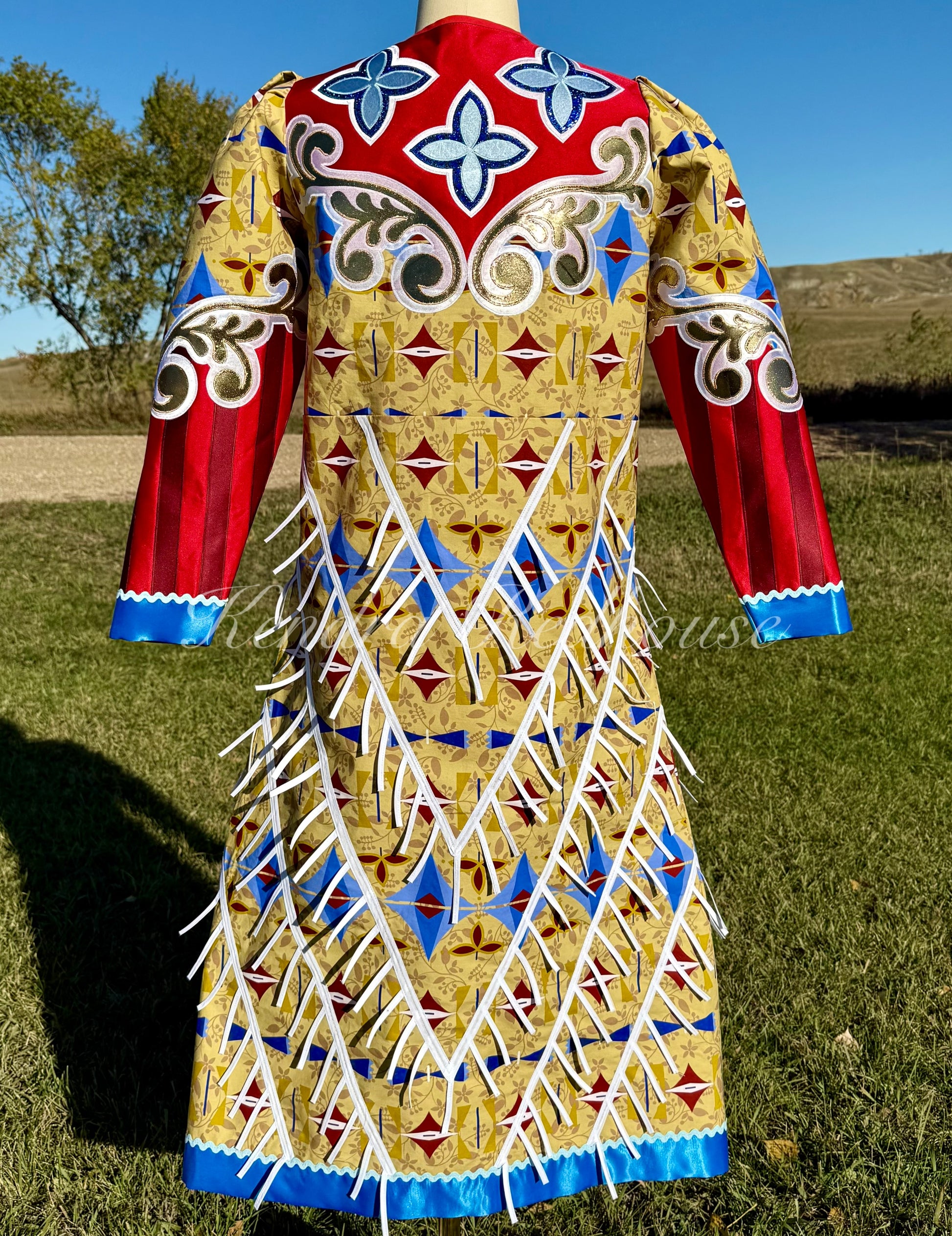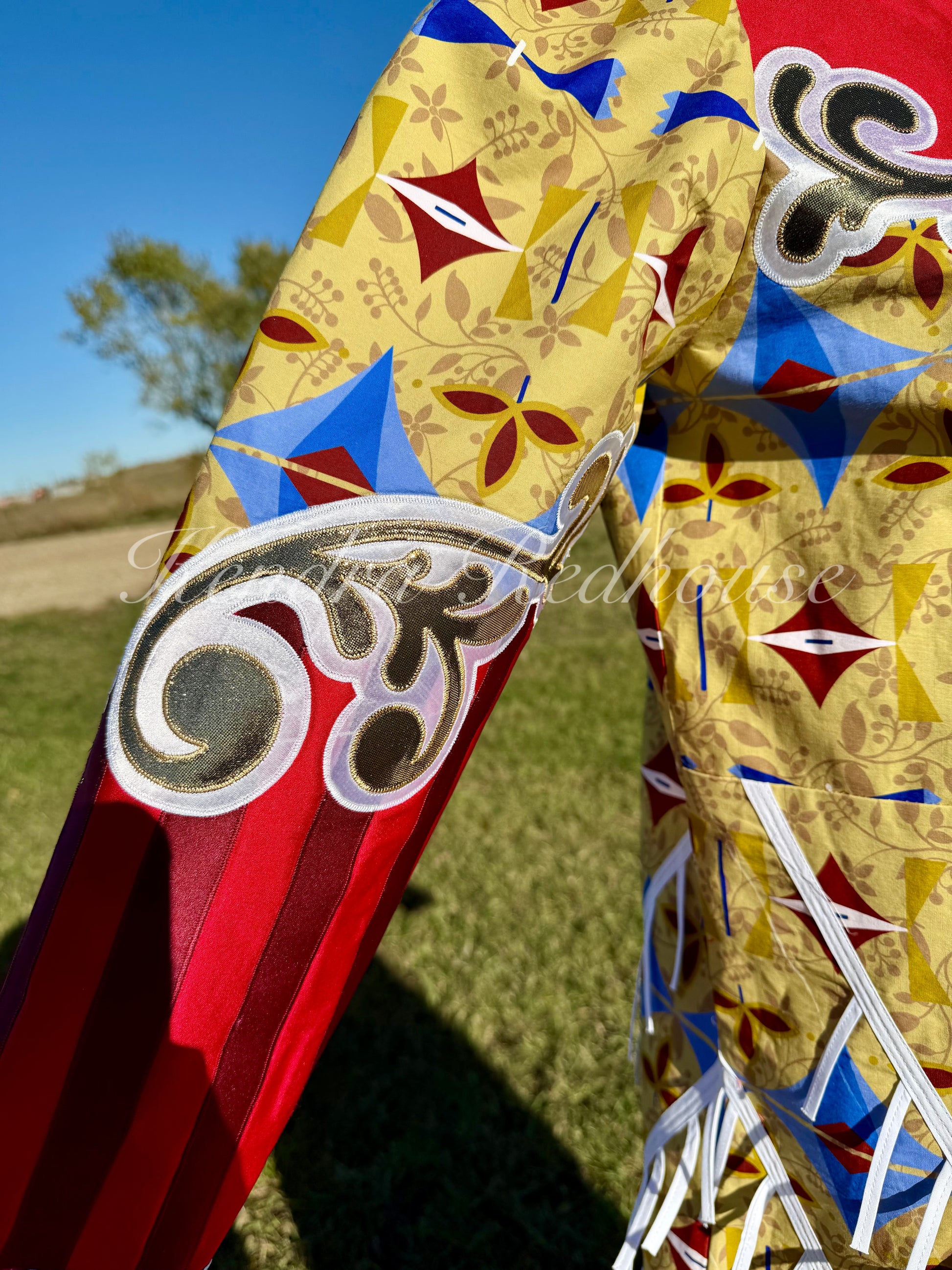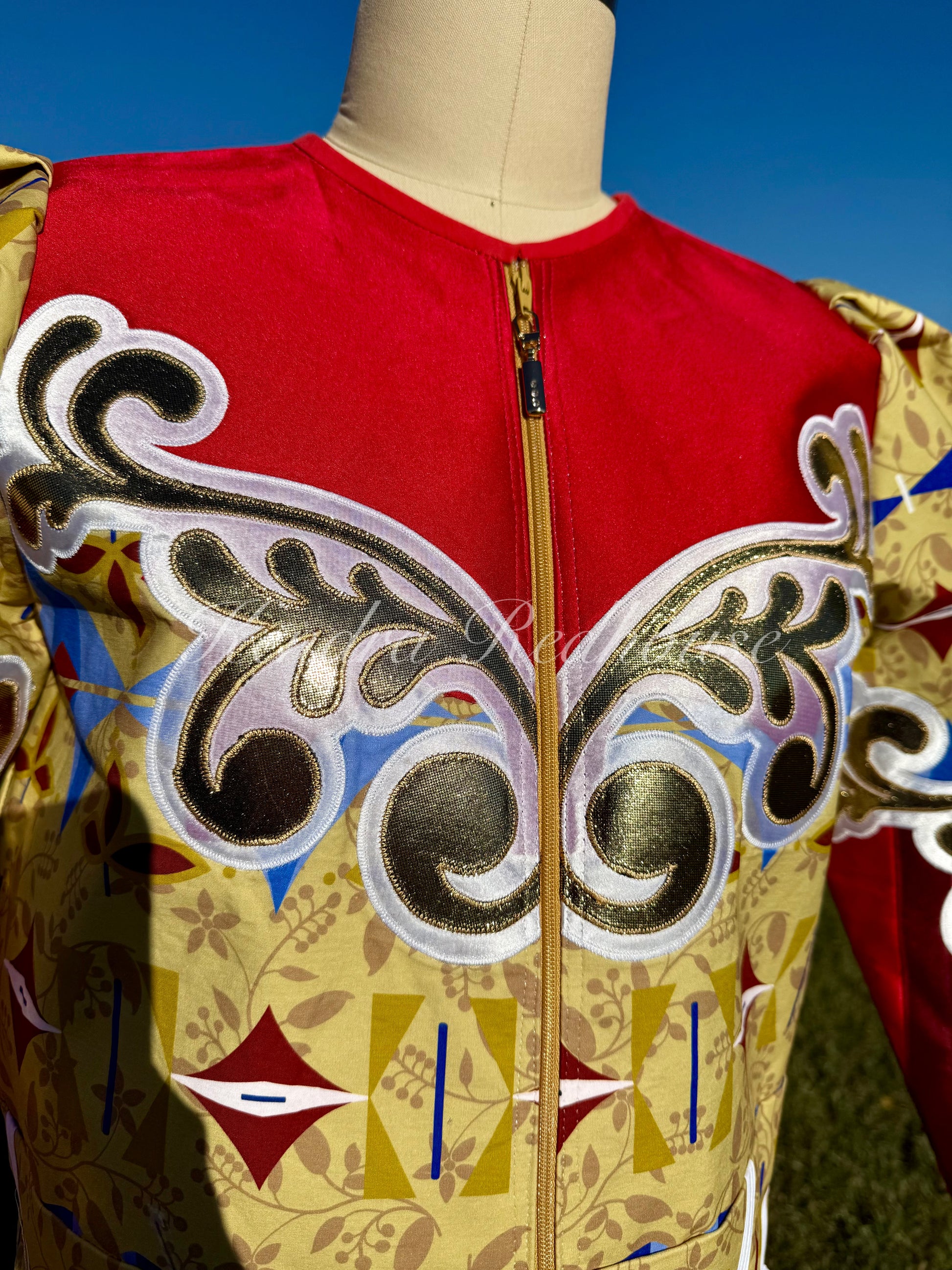 This eye-catching dress features a unique combination of amber gold and floral design. Made with sturdy cotton and satin materials, and a light cotton lining, this one-of-a-kind jingle dress will make you stand out in any occasion. With accents of bright red and dark red, it is a true eye dazzler. This is the final dress in my powwow collection. And thank you for all the support.